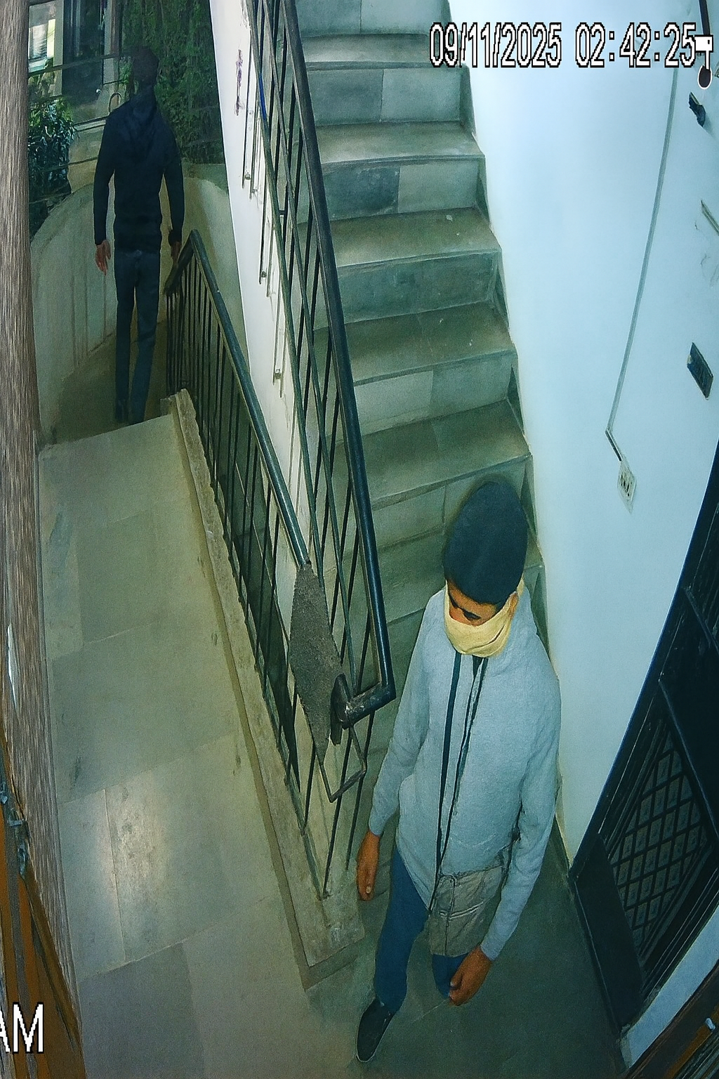 Late-night theft attempts were reported in Pragya Kunj and Vartalok societies in Vasundhara, Ghaziabad, where thieves allegedly targeted locked apartments. CCTV visuals show the suspects moving around the premises and surveying flats that appeared unoccupied. The same duo, previously captured in footage from Richmond Park and Manokamna Apartment, has now been spotted in these societies as well. Their attire remains consistent, with handkerchiefs tied around their faces to conceal their identity. Based on the footage, the thieves appear to be the same individuals seen in earlier incidents.