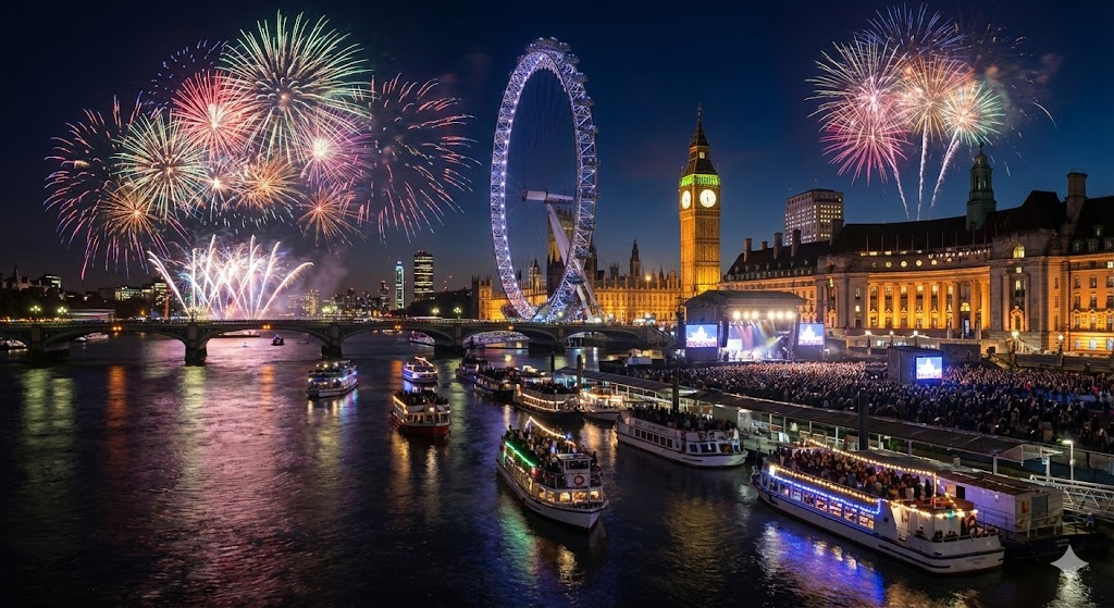 The city is treated to a breathtaking scene as brilliant fireworks brighten the River Thames. The river makes the New Year's celebration special by representing London's powerful beauty through Big Ben, the London Eye, and the Parliament Buildings. Ballrooms and music add excitement to the evening.